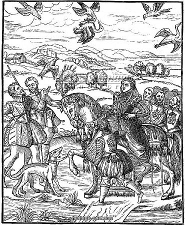 Queen Elizabeth and her attendants out hawking -- Her Majesty is riding side-saddle; the man at left has just released his hawk, while above a hawk is bringing down a bird