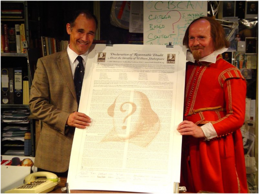 Actor Mark Rylance, left, has been a vocal public figure on the Shakespeare authorship question — here with actor Colin Hurley, holding the Declaration of Reasonable Doubt in Chichester on September 8, 2007