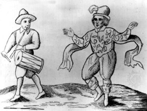 William Kempe, one of the most famous “clowns” of the Elizabethan era, performing the “Morris” dance
