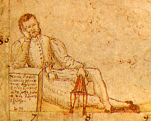 Laurence Nowell's self portrait (with empty purse) at lower left corner of a pocket map he made for Wm. Cecil