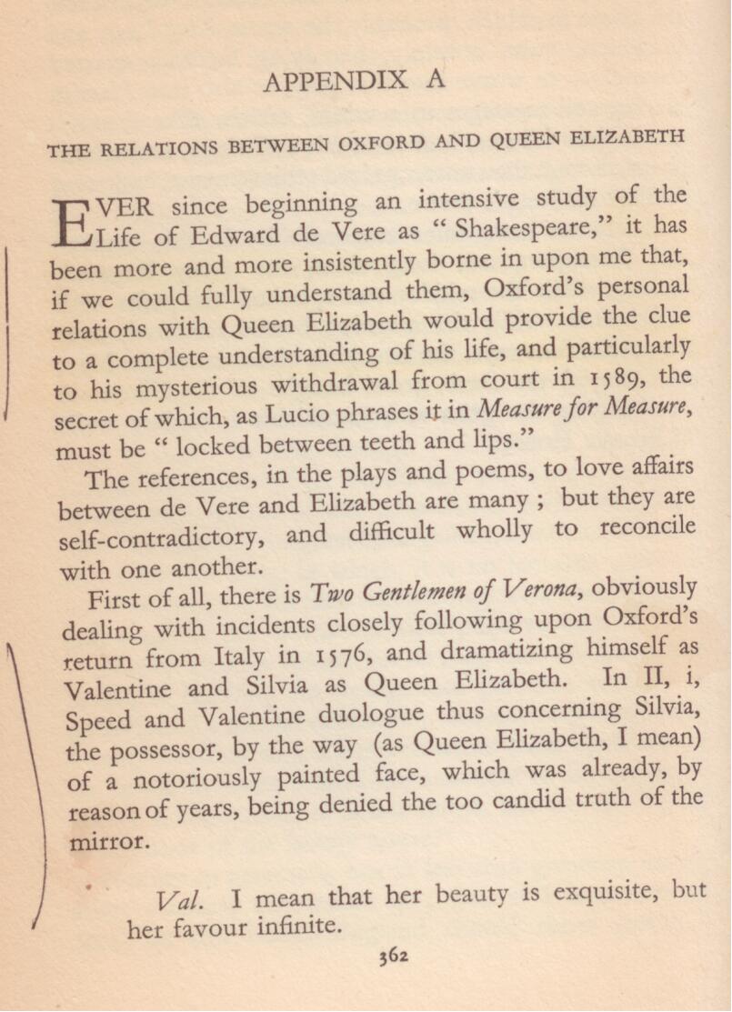 “First of all, there is The Two Gentlemen of Verona, obviously dealing with incidents closely following upon Oxford’s return from Italy in 1576, and dramatizing himself as Valentine and Silvia as Queen Elizabeth…