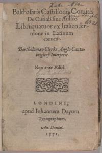The Latin translation of The Courtier by Bartholomew Clerke in 1571, published from the Royal Court with Oxford’s blessing